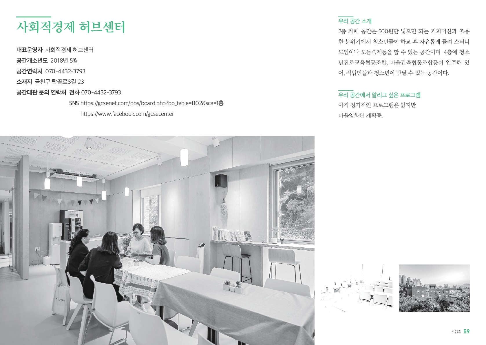 금천구 사회적경제허브센터의 대관 시설을 운영하고 있으며, 금천구 소재 사회적경제 조직과