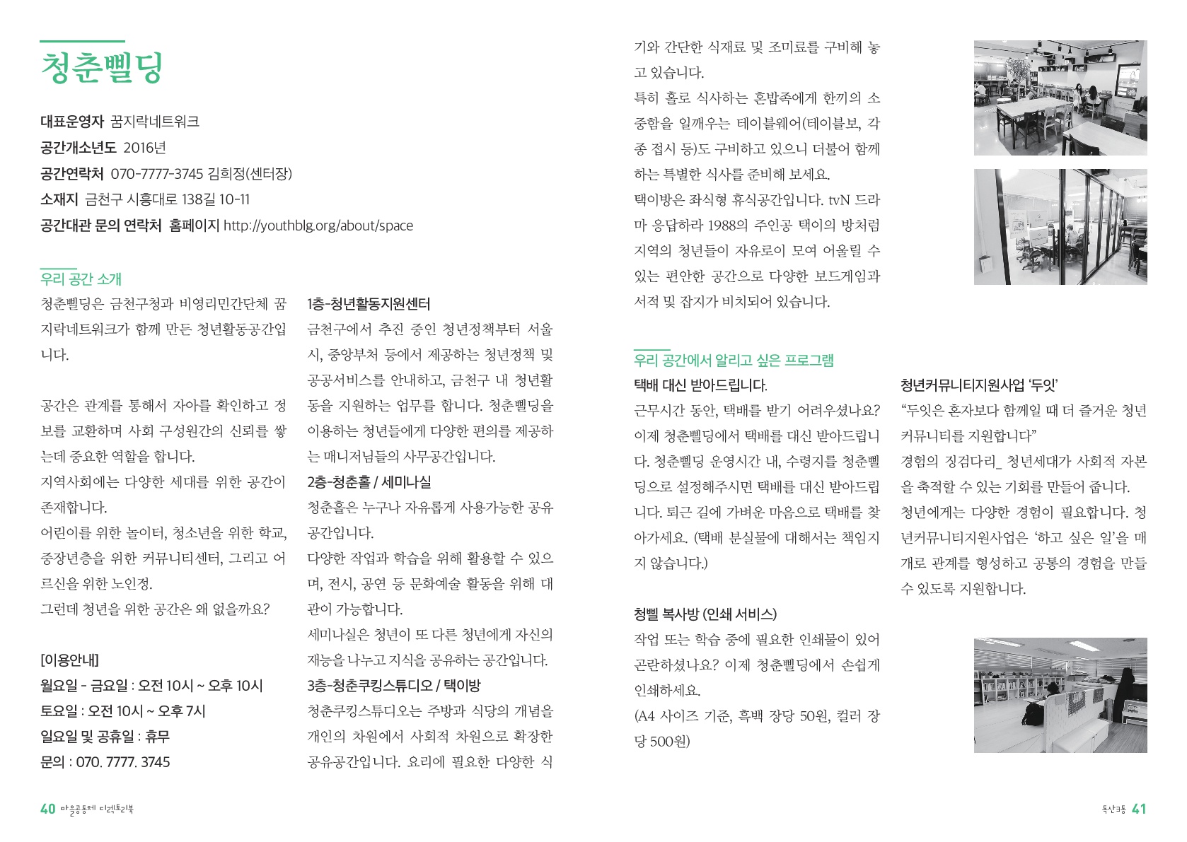 청춘삘딩은 금천구청과 비영리민간단체 꿈지락네트워크가 함께 만든 청년활동공간입니다.