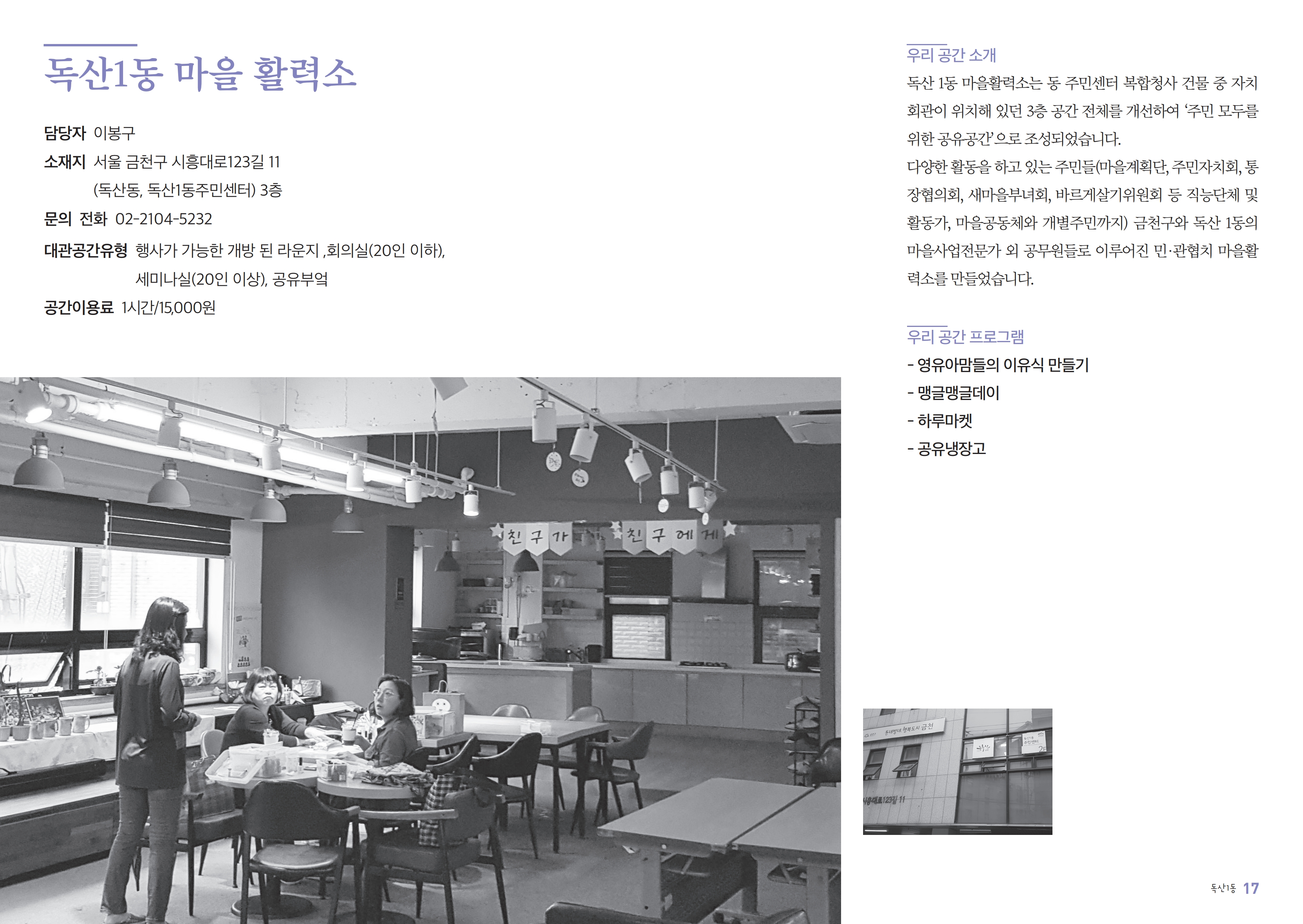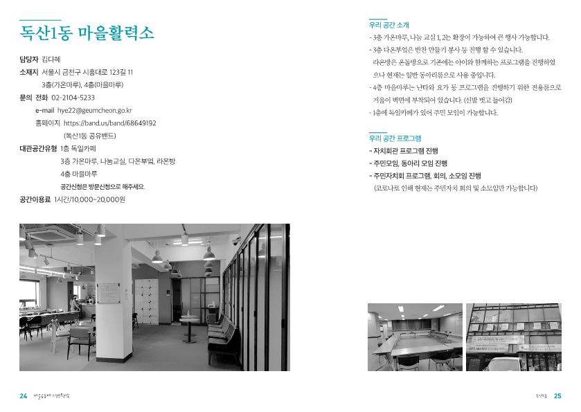 독산1동 마을활력소 2019-12-23 11:23:38 * 대관, 대여 가능한 공유자원을 함께 적어주세요. 공간이용료 1시간/15,000원 LIST 이전해오름 작은도서관2019.12.23 다음가산동 마을관리소2019.12.23