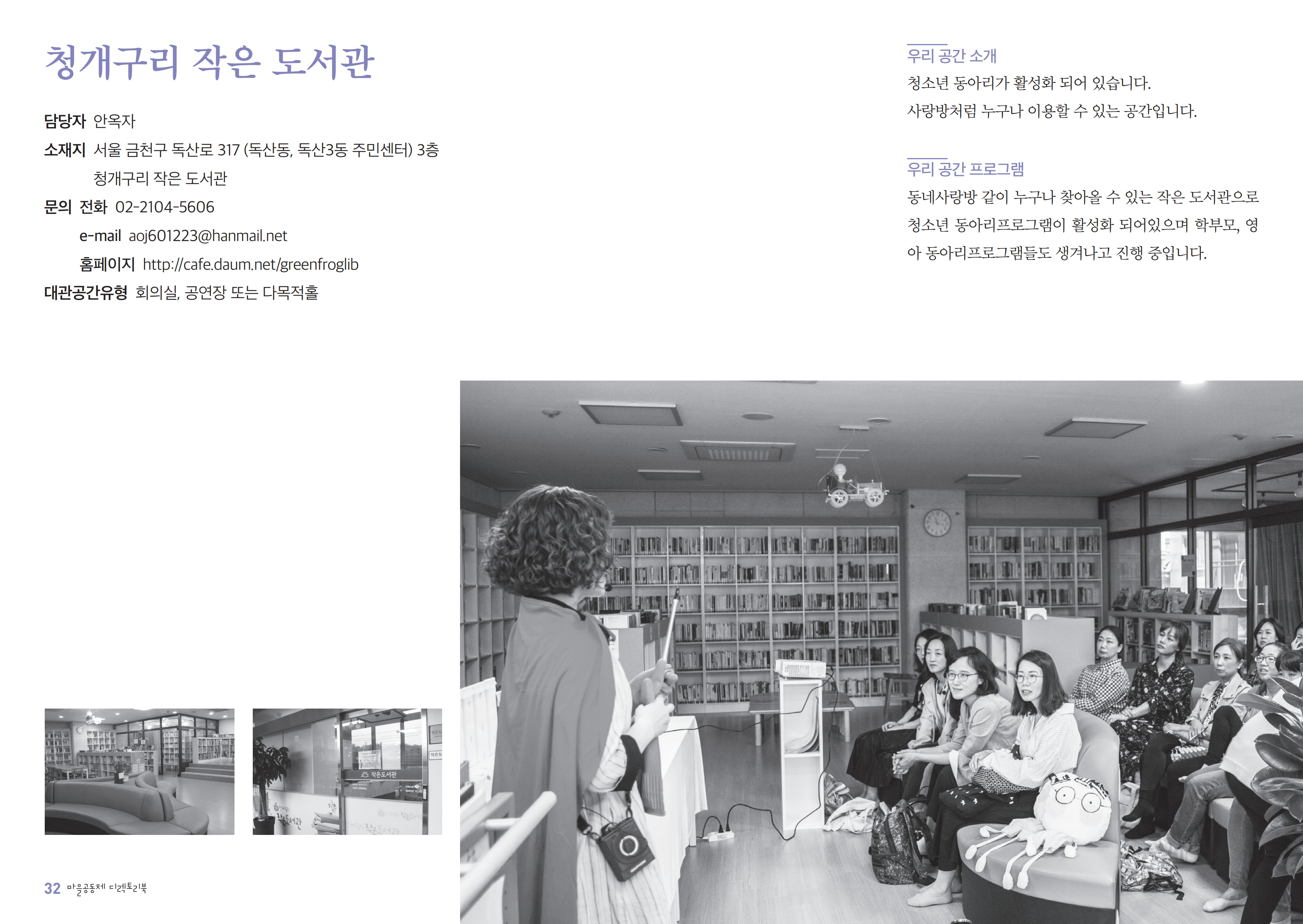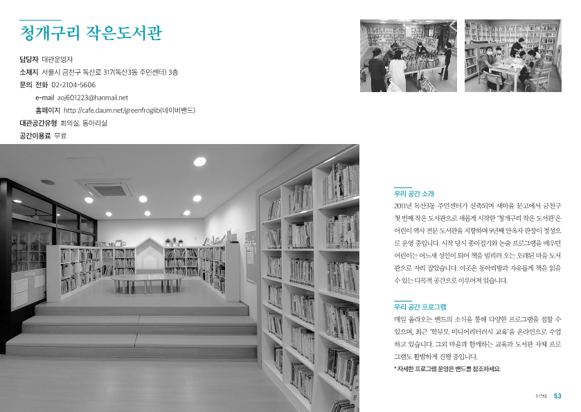 청개구리 작은도서관 2019-12-23 11:49:46 http://cafe.daum.net/greenfroglib * 대관, 대여 가능한 공유자원을 함께 적어주세요. LIST 이전청춘 삘딩2019.12.23 다음미래향기 작은도서관2019.12.23
