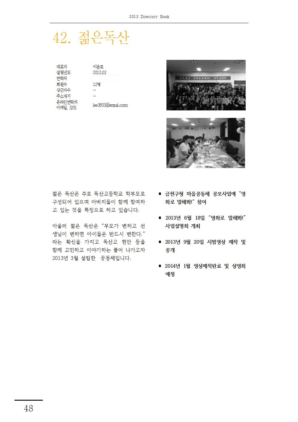 2013-42.부모가 변하고 선생님이 변하면 아이들은 반드시 변한다-젊은독산 2018-11-21 14:07:55 LIST 이전2013-43.지역의 낙후함,현대 사회의 병폐를 스스로 극복하자-중앙희망지기2018.11.21 다음2013-41.어린이들에게 좋은 책과 공간으로 희망을 주는-은행나무어린이도서관2018.11.20