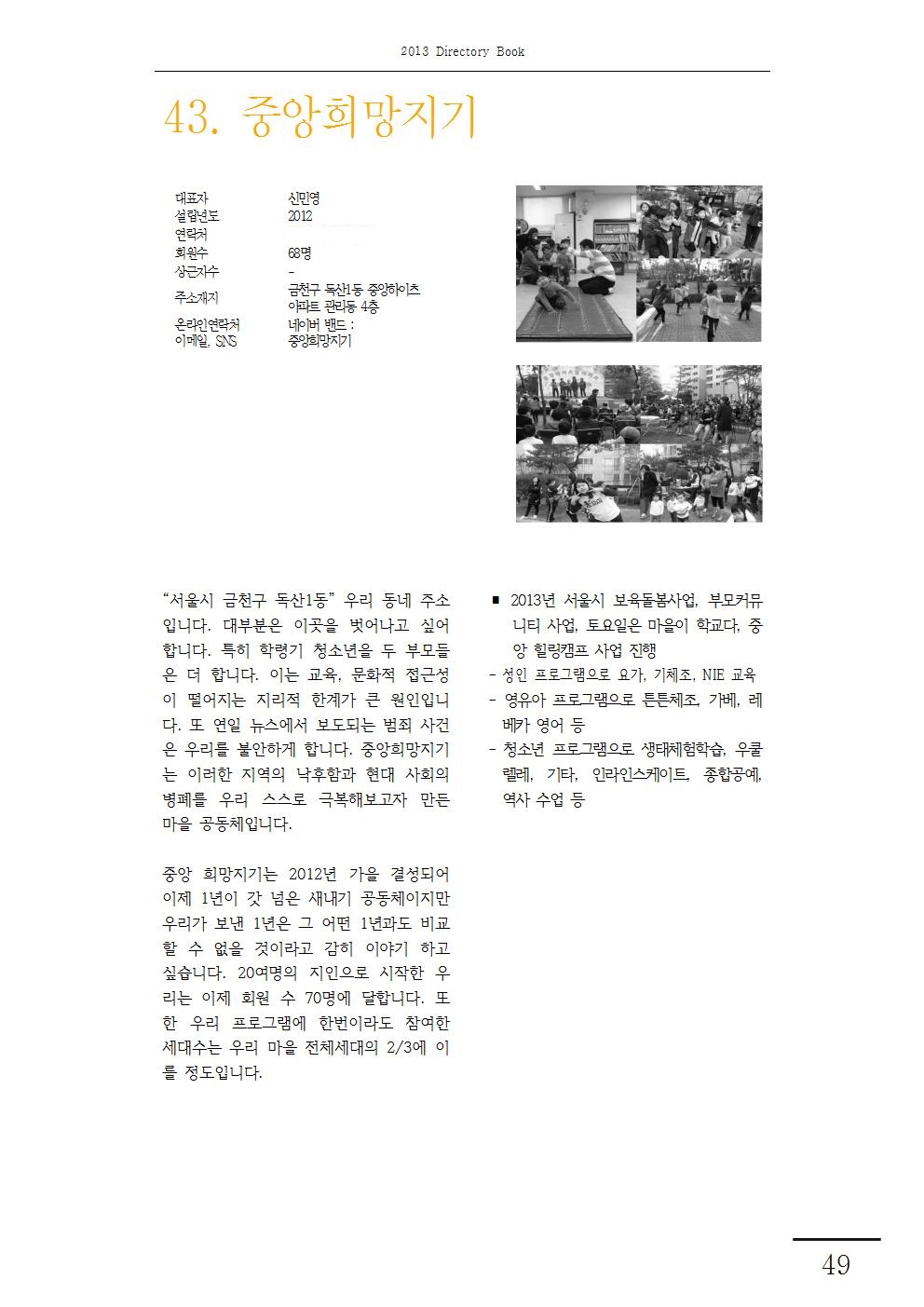 2013-43.지역의 낙후함,현대 사회의 병폐를 스스로 극복하자-중앙희망지기 2018-11-21 14:10:48 LIST 이전2013-44.다양한 문화 창구 역할을 하는 마음충전소-책이든거리 작은도서관2018.11.21 다음2013-42.부모가 변하고 선생님이 변하면 아이들은 반드시 변한다-젊은독산2018.11.21