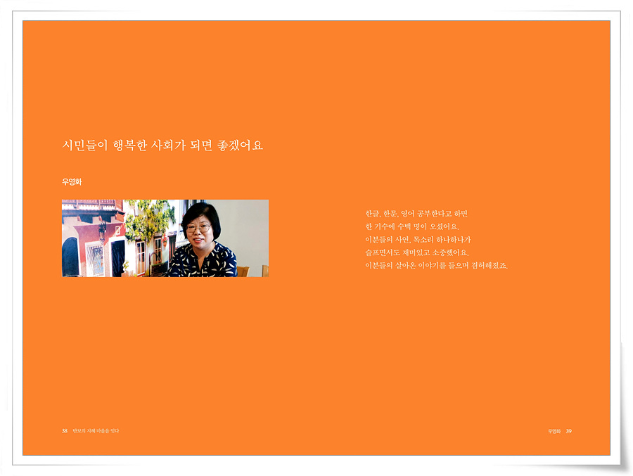 1990년대 금천구에는 사회복지기관이 별로 없어서 한글, 한문, 영어 공부한다고 하면 한 기수에 수백 명이 오셨어요. 이분들의 사연, 목소리 하나하나가 슬프면서도 재미있고 소중했어요. 이분들의 살아온 이야기를 들으며 겸허해졌죠.