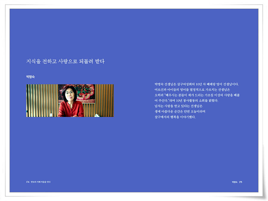 박명숙 선생님은 살구여성회의 10년 차 베테랑 영어 선생님이다. 어르신과 아이들의 영어를 열정적으로 가르치는 박명숙 선생님은 오히려 “배우시는 분들이 제가 드리는 가르침 이상의 사랑을 베풀어 주신다.”라며 10년 봉사활동의 소회를 밝혔다. 넘치는 사랑을 받고 있다는 박명숙 선생님은 생에 아름다운 순간은 단연 오늘이라며 살구에서의 행복을 이야기했다.
