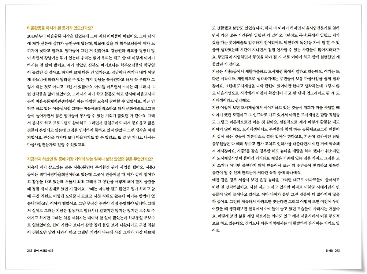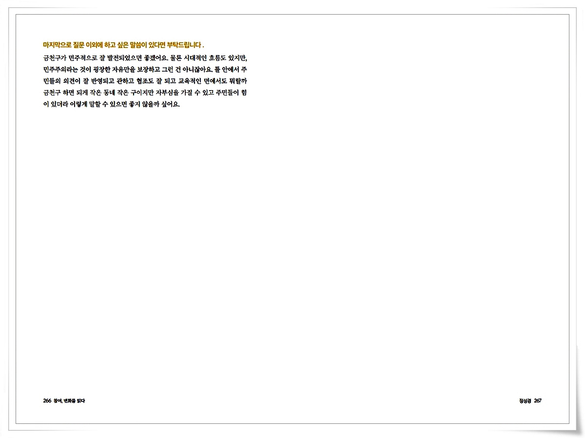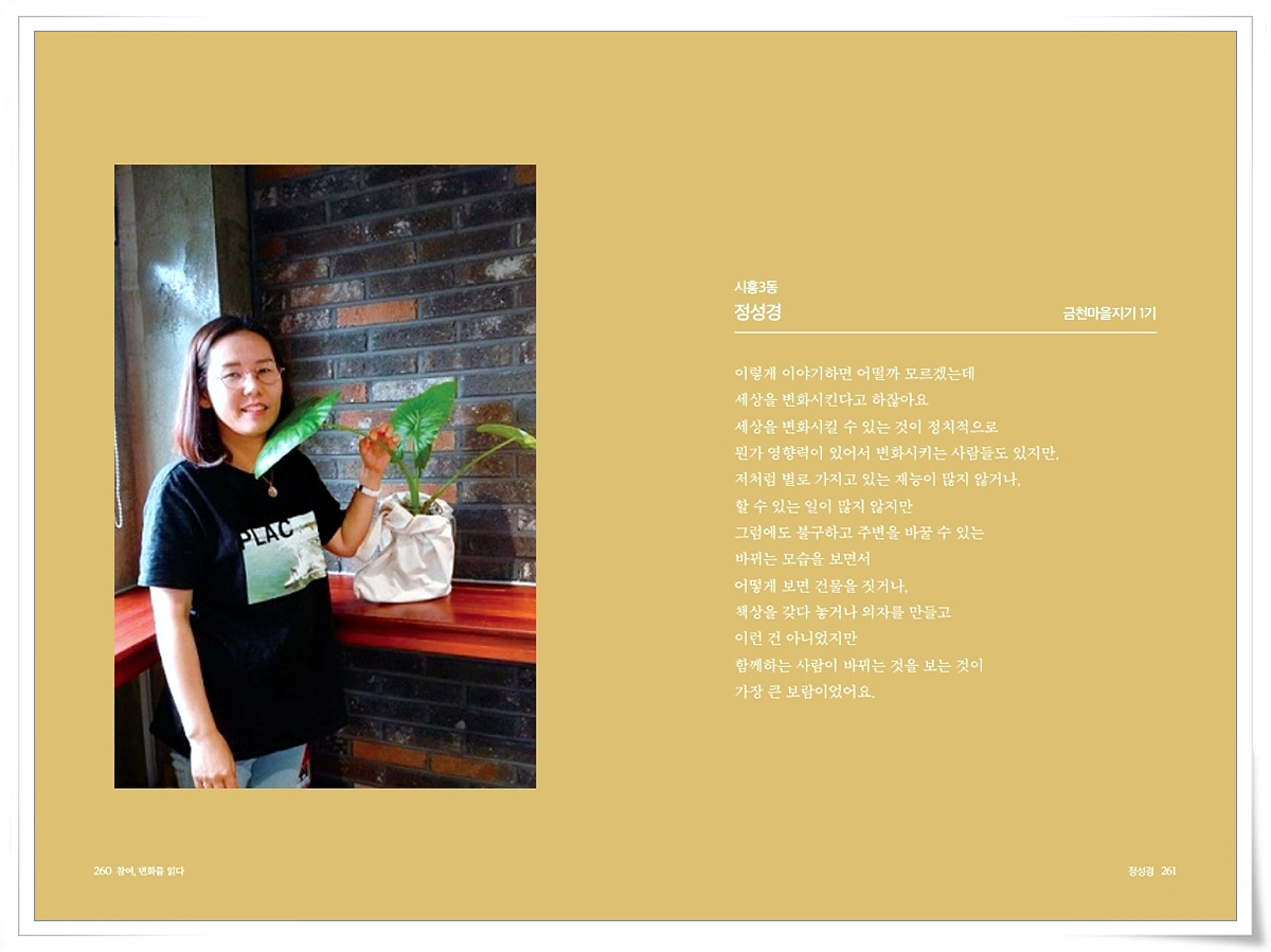 금천사람들 인터뷰 기록집Vol.1_ 시흥3동 정성경 2021-03-18 16:39:37 금천사람들 인터뷰 기록집Vol.1_ 시흥3동 정성경 ▼아래 이미지를 누르시면 크게 보실 수 있습니다 LIST 이전금천사람들 인터뷰 기록집Vol.1_ 시흥4동 강영자2021.03.18 다음금천사람들 인터뷰 기록집Vol.1_ 시흥3동 장제모2021.03.18