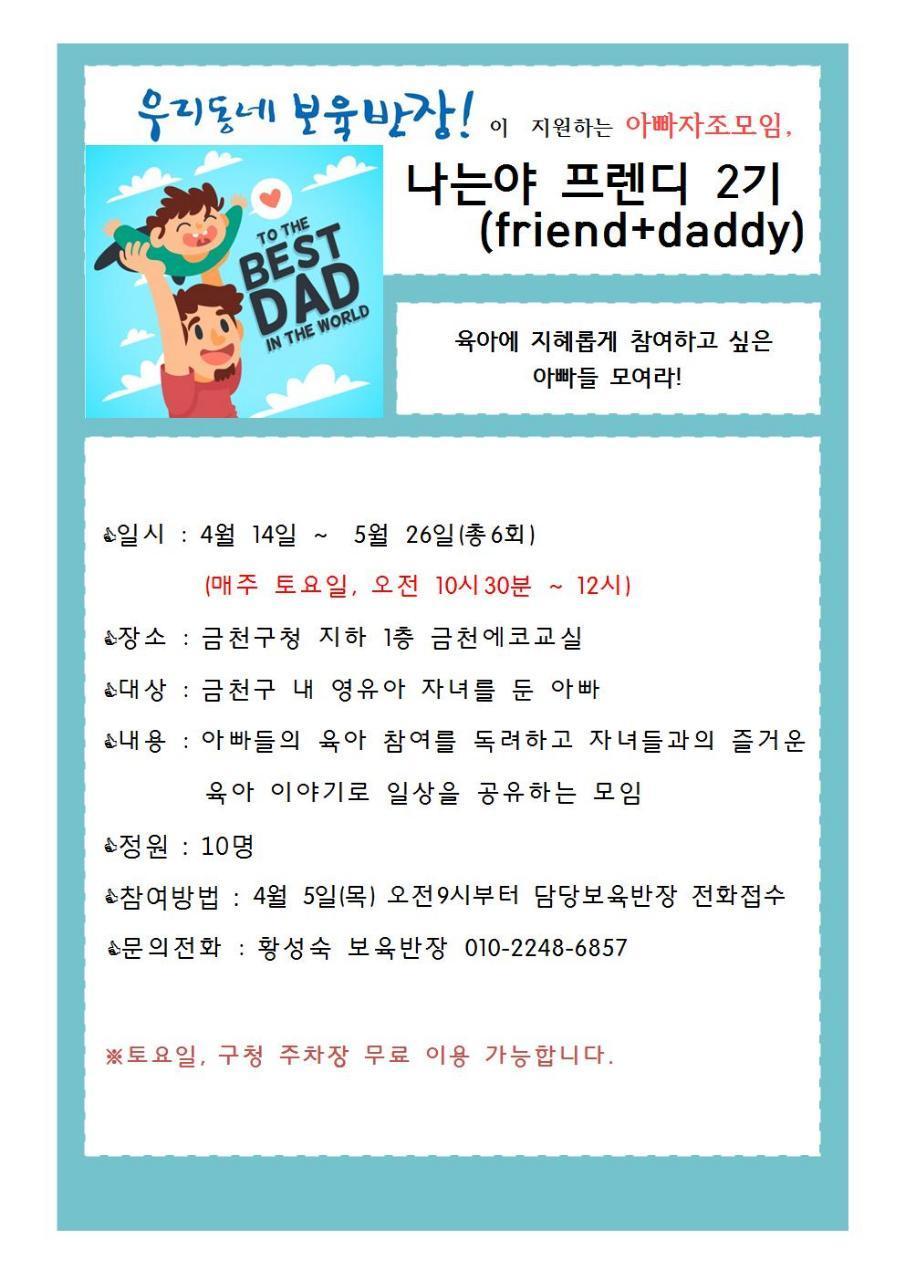 육아스트레스도 덜고, 육아노하우도 공유하며 일상에 지친 남자들의 마음을 위로와 공감으로 함께 할 금천구 육아대디를 모집합니다~