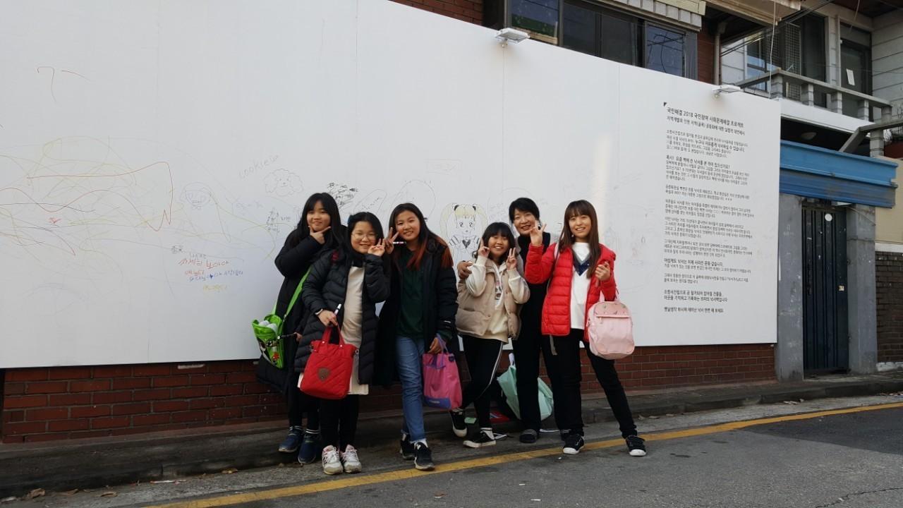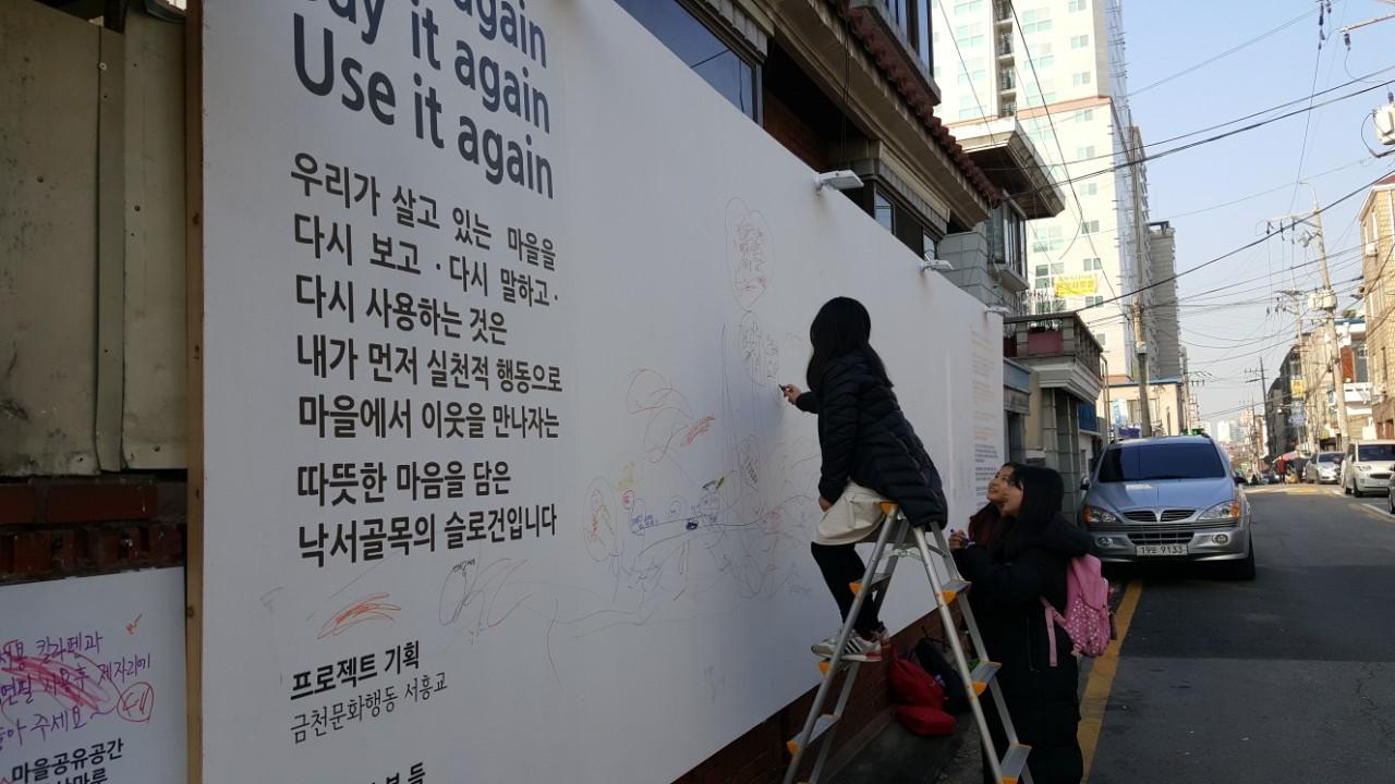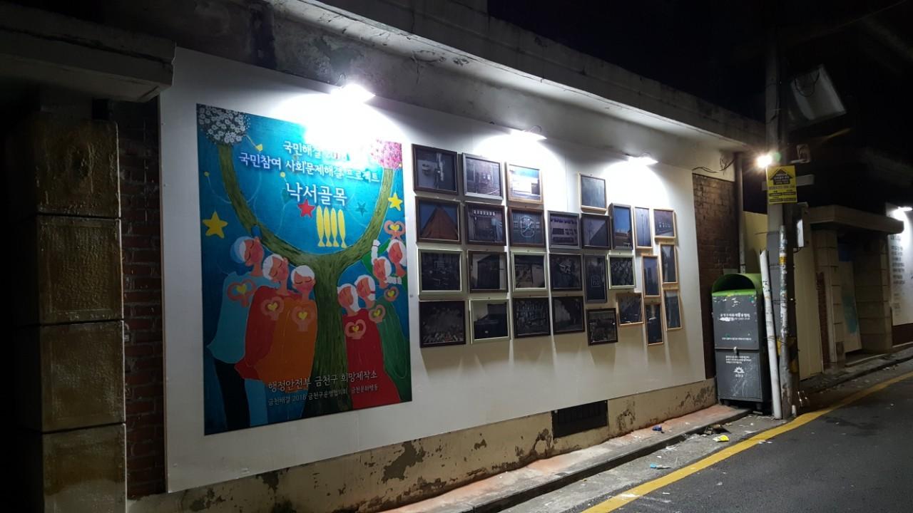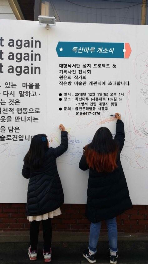 독산마루 앞 골목길(소방서건립 예정지 뒷길)에서 대형낙서판 설치프로젝트와 철거될, 건물에 대한 기록사진 전시회