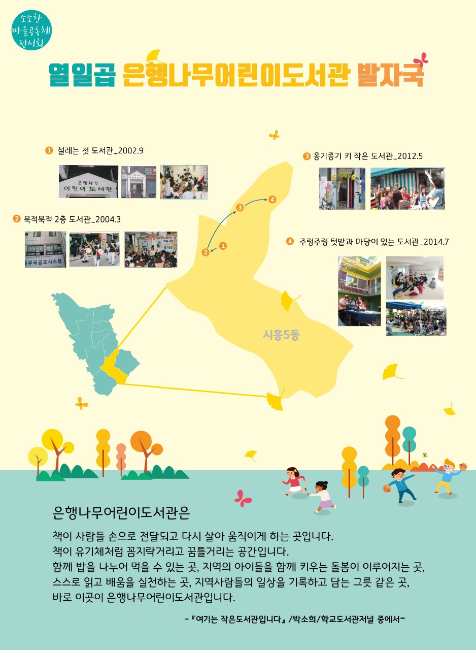 2002년 9월 개관하던 은행나무어린이도서관은 시흥5동의 900년 은행나무처럼 오래도록 마을 아이들과 어른들의 꿈과 희망을 키워가는 든든한 곳이기를 바라는 마음을 담아 시작하였습니다, 그동안 3번의 이사를 하였고, 현재 4번째 장소 탑골로를 지키고 있습니다. 이사를 할 때마다 경제적 위기 위기들이 있어 옮기게 되었고 감사하게도 함께하는 이들이 있어 시흥5동 이곳을 지행할 수 있었습니다. 함께였기에 자리를 지키겠다는 약속을 지켰고 열일곱 살이 되었습니다.