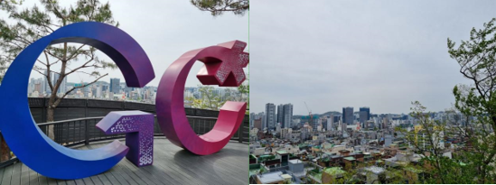 엄마와 전망대까지 아마 20분도 안 걸렸던 것 같아요. 이곳은 체육공원의 가장 높은 곳이기도 해요. 금천‘GC’라고 적힌 구조물이 있었는데, 밤이 되면 불이 들어오는 것 같더라고요.