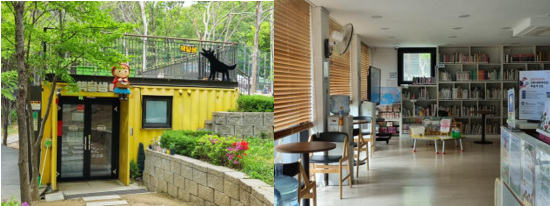 드디어 지상까지 내려왔어요, 작은 도서관 하나를 발견했어요. 여름에 너무 더울 때는 이곳에서 책도 읽고, 잠시 쉬면서 시원한 에어컨 바람도 쐬면 정말 좋을 것 같아요. 이런 공간이 있다는 게 참 멋지더라고요.