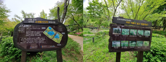 공원에는 다양한 식물들이 있었고, 식물 사진이 붙어 있는 안내판도 있었어요. 아이들이 자연 속에서 식물을 배우고 알아가기 좋은 장소인 것 같아요.