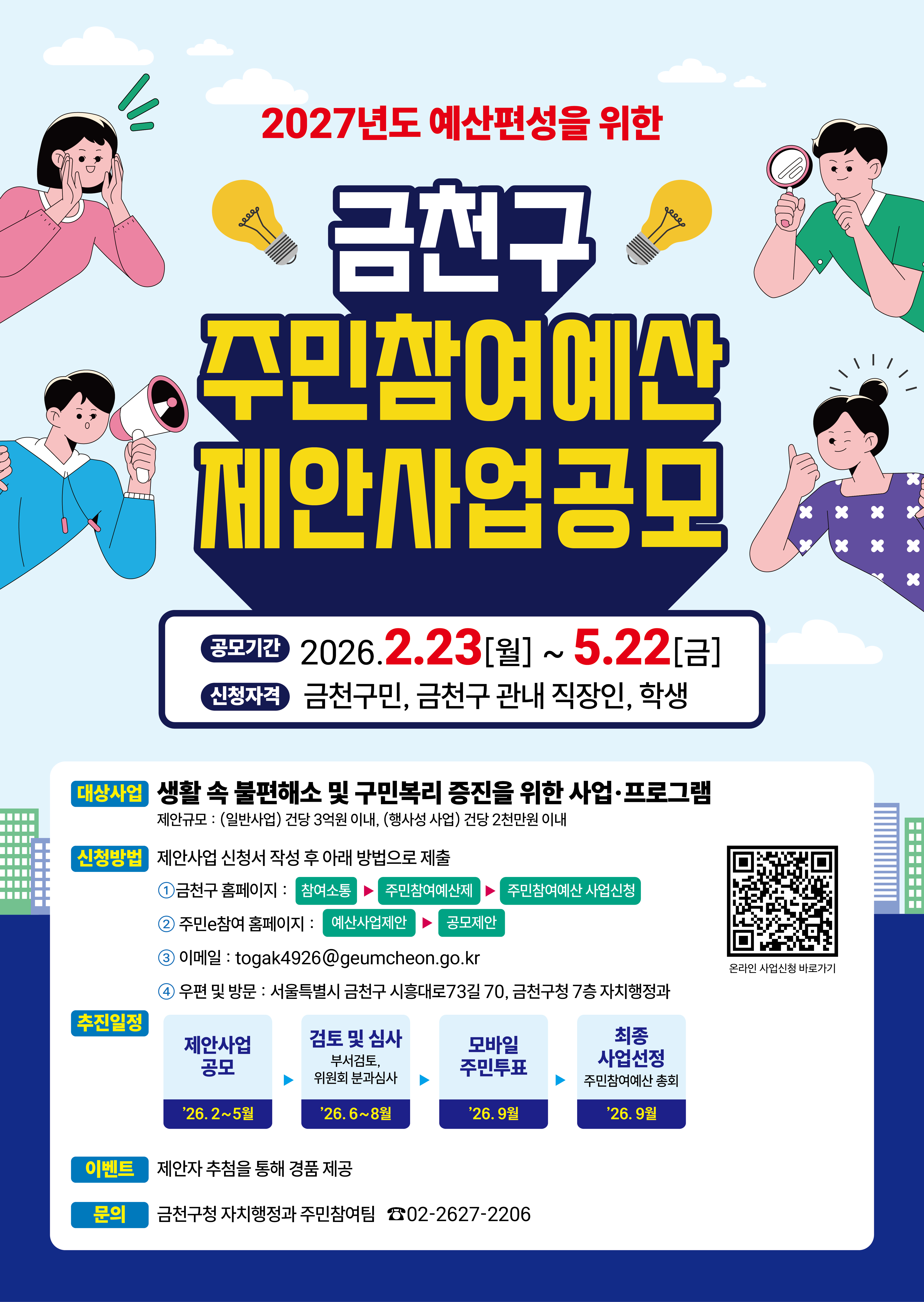 2027년도 예산편성을 위한 금천구 주민참여예산 제안사업 공모를 실시하오니, 많은 참여와 관심 부탁드립니다.
