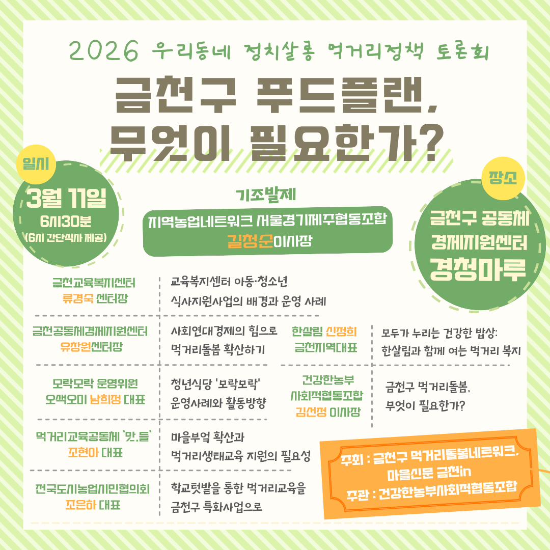 2026 우리동네 정치돌봄 먹거리정책 토론회 금천구 푸드플랜, 무엇이 필요한가?