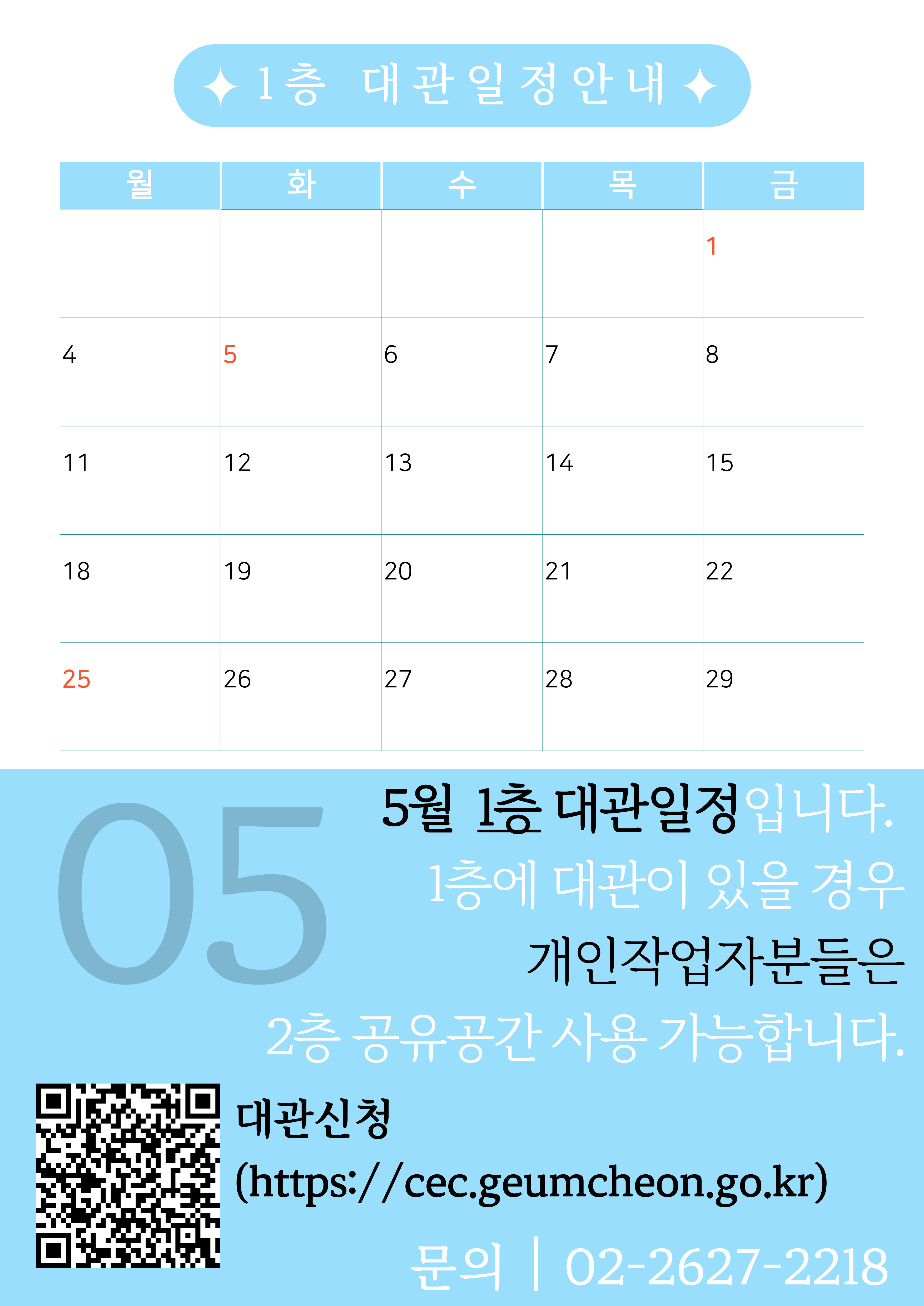 [5월] 공동체경제 통합지원센터 1관 대관일정 2026-04-24 09:24:29 5월대관.jpg LIST 이전2026년 협동조합 상생 성장 어부바 프로젝트 참여기업 모집 2026.04.28 다음[취약계층자립지원] 2026년 SVI 측정 컨설팅 희망기업 모집 (~05/17)2026.04.22
